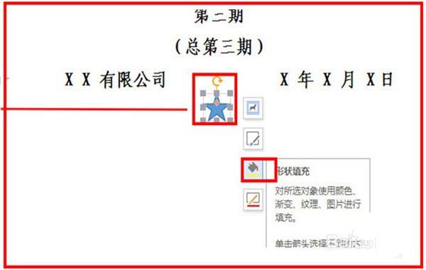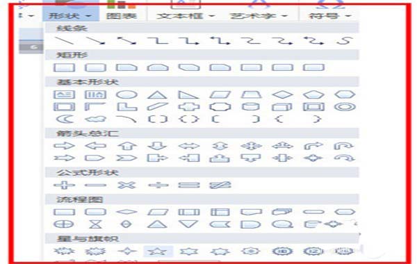 6、接着插入五角星,找到插入,找到形状,找到五角星,单击选中五角星,五角星出现在文档后,单击选中,可以进行拖动,填充进行设置颜色等,把五角星的边线需要设置成无颜色。