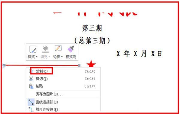 7、最后,再选中直线,单击右键,单击复制,在一旁,单击粘贴,把直线移动到五角星的另一侧,调整一下和上方文字的距离等,在直线的下方输入简报的具体内容名称,另起一行,输入正文就完成了简报。