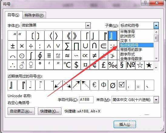 3、在打开的符号窗口中,我们点击字体为"微软雅黑",在子集一项中选择"标点和符号"菜单项