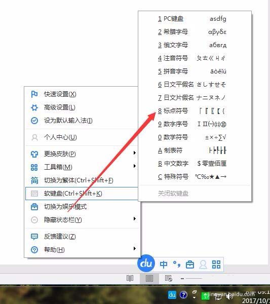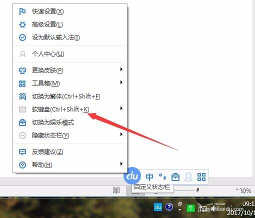 2、接着我们右键点击输入法工具条,然后在弹出菜单中选择"软键盘"菜单项