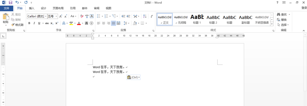 1、打开word 2013,敲出word在手,天下我有的字样,并且复制一行,作为后续使用。