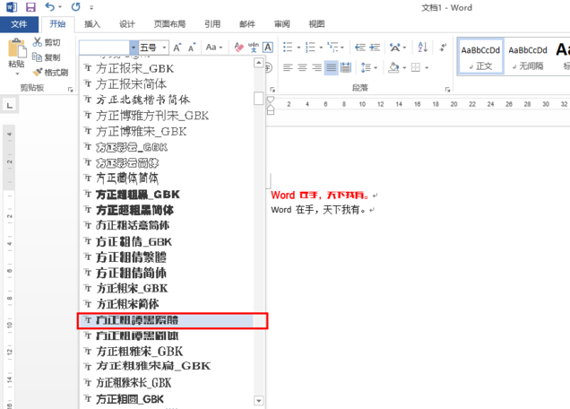 3、把字体改为红色后,我们选中第一行的字体,把宋体改为方正粗谭黑繁体。