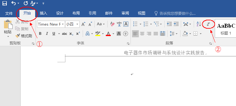 1、点击"开始"选项,图中序号①所示,再单击序号②所示的图标,即可显示所有分页符。