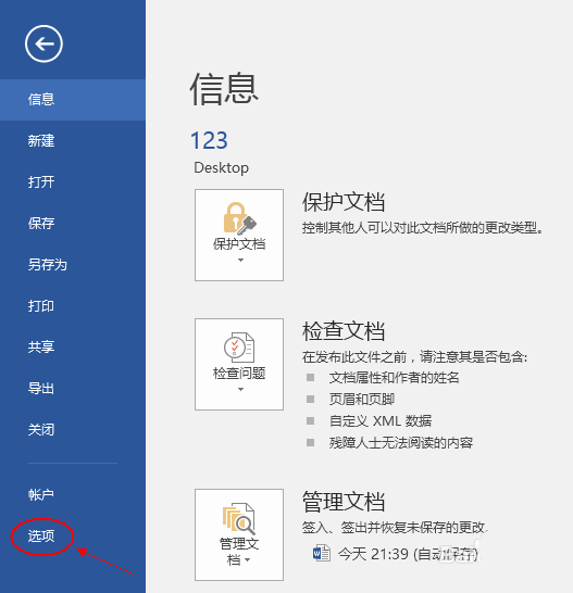 2、进入"文件"选项之后,会出现如下菜单,再选择最后一项"选项"。