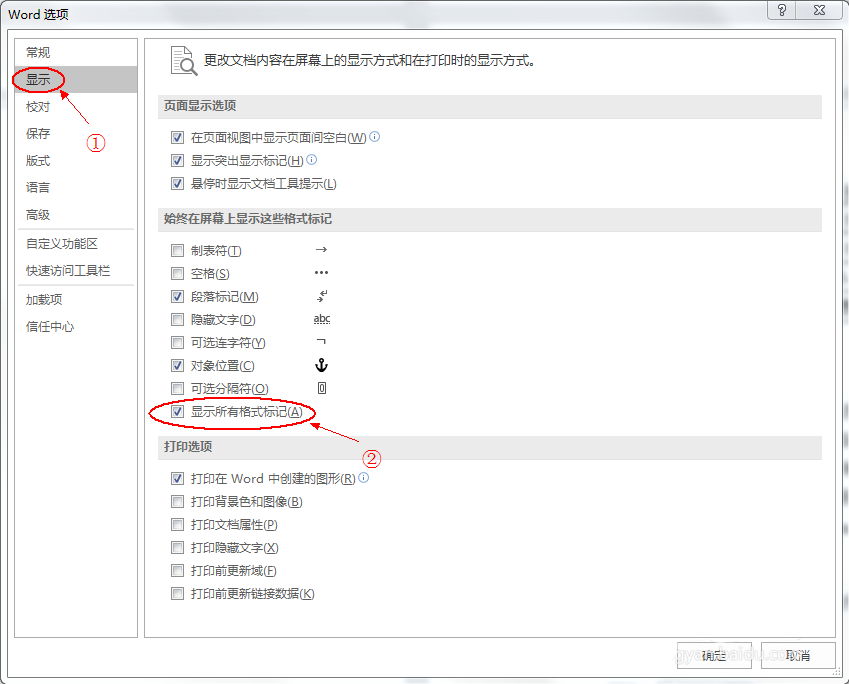 3、进入"选项"菜单,先单击"显示"菜单,会出现如下界面,再点击"显示所有格式标记(A)"选项前的小方格,选定后确定即可显示所有分页符。