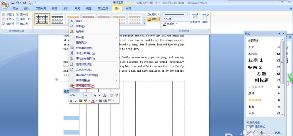 1、把光标放在表格中,单击鼠标右键,选择【表格属性】
