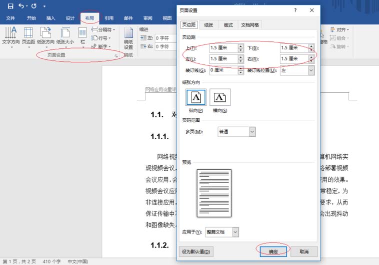 1、首选我们得设置文档的总体布局。点击【布局→页面设置】右下箭头,唤出"页面设置"对话框。选择"页边距"标签,上、下、左、右之页边距均设为1.5厘米。