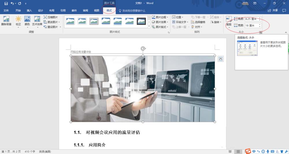 2、接下来选择文档标题上方的插图。点击【插入→插图→图片】,唤出"插入图片"对话框。选择事先准备好的精美图片,点击"图片工具→格式→大小"功能区,缩放、裁剪图片使其宽度、画面满足文档的风格。