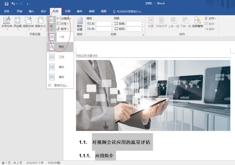 3、选中所有文字内容进行分栏处理。点击【布局→页面设置→栏】向下箭头,选择"两栏"。