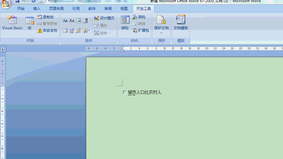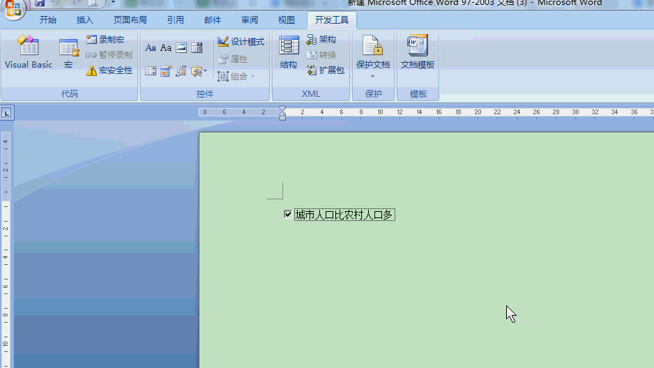 4、这时发现文字并没有显示完整,点击【复选框】然后点击【开发工具】→【设计模式】把复选框调整到合适的大小。