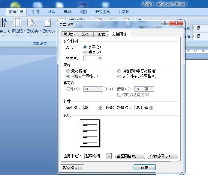 1、新建一个空白文档,在菜单栏上选择"页面布局"菜单下的对话框启动器,打开"页面设置"对话框后,将文档网格下的栏数设为1,网格设置为只指定为行网格,最后将每页行数设置为20行。