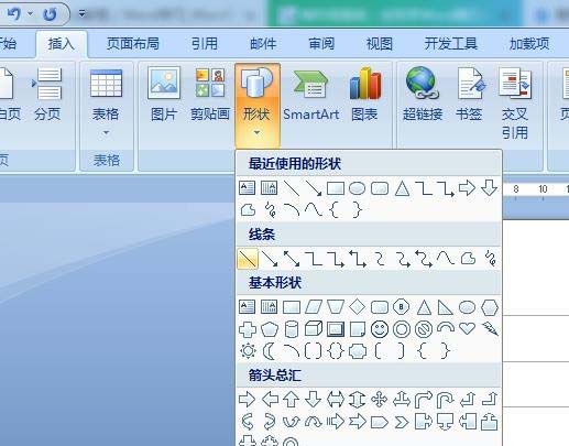3、点击"插入"菜单按钮,在"插图"选项中,打开"形状"按钮,选择"线条"中的直线。