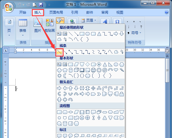 1、首先打开word软件,【插入】——【线条】——【直线条】,如图所示;