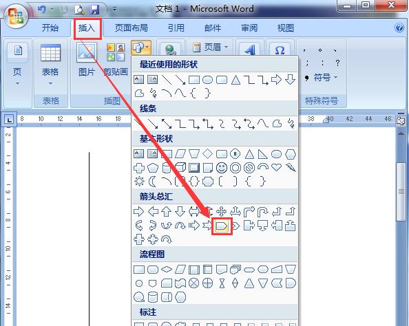 2、在文档上画出一条线条后,继续点击【插入】——【箭头总汇】——【五边形】,如图所示;
