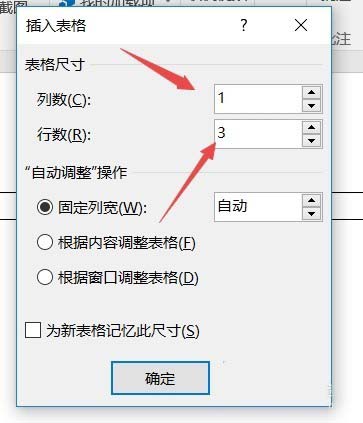 3、这时会弹出一个插入表格的设置窗口,在这里输入行为3,列为1,然后点击确定按钮。