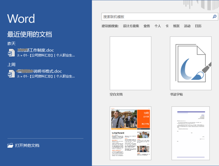 1、启动Word 2016,选择打开文档选项或文档模板选项执行打开、新建文档的操作。