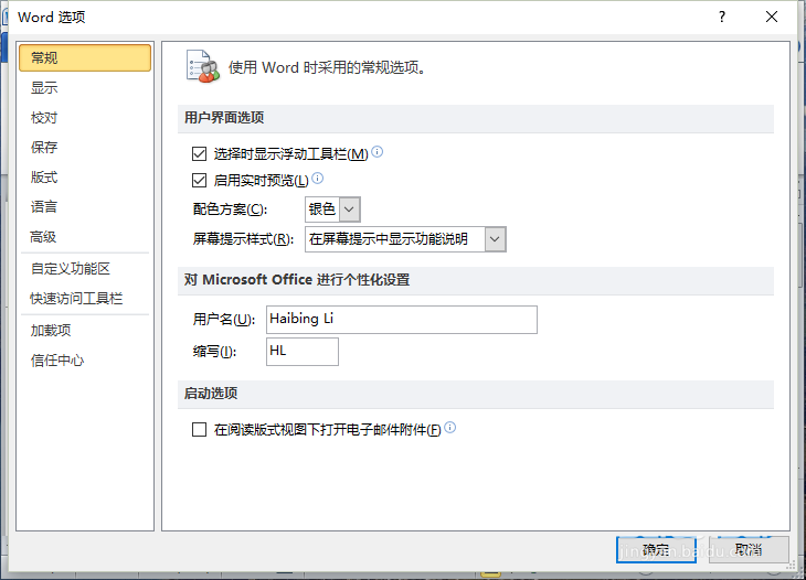 4、点击"选项"命令选项后,这个时候会弹出工作簿的"Word选项"对话框。如图所示;
