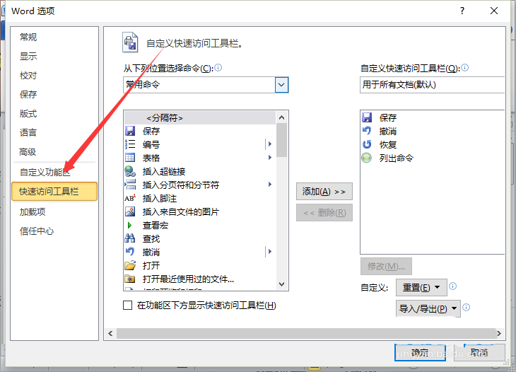 5、在弹出的"Word选项"对话框中,选择并点击"快速访问工具栏"选项卡栏。如图所示;