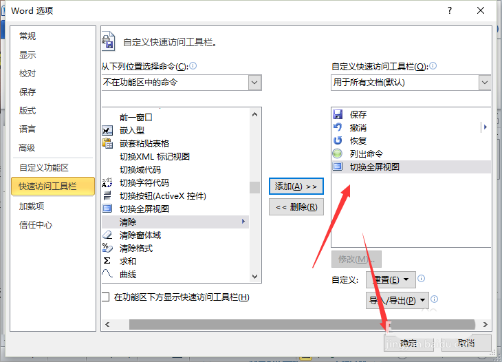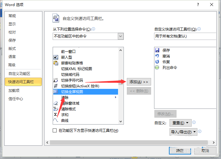 6、在"快速访问工具栏"选项卡的右侧窗格中,在"从下列位置选择命令"中选择"不在功能区的命令",再将"切换全屏视图"添加到"自定义快速访问工具栏"。如图所示;