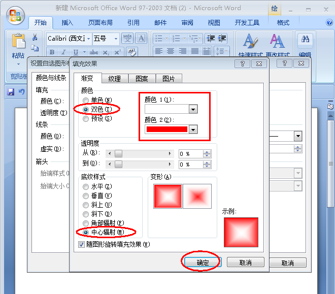 6、颜色选择"双色",这里小编选择红色和白色,底纹样式选择"中心辐射",然后点击确定(如图);