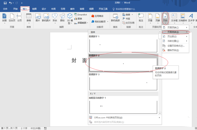 4、接下来选择页码的显示方式。再次点击"页码"向下箭头,选择"页面底端→普通数字2"。