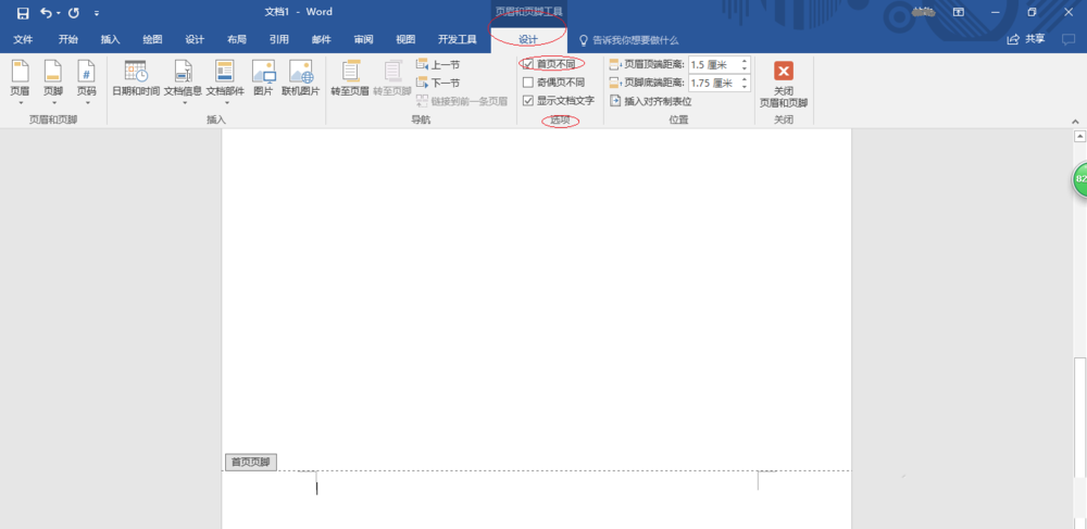 5、点击"设计→选项"功能区,勾选"首页不同"。这样就完成了封面不显示页码的制作,大家不妨试试。