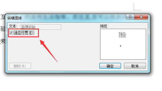 6、在纵横混排对话框内找到适应行宽选项,将其前面的勾选去除,如图所示: