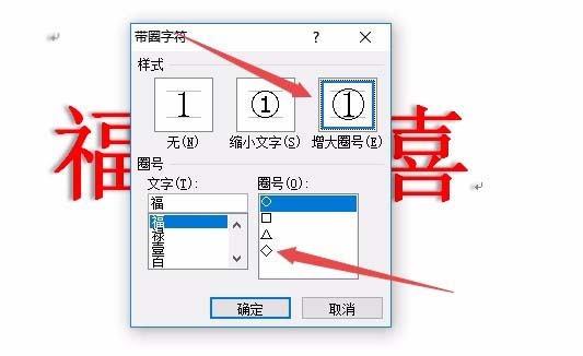 3、这时就会打开带圈字符设置窗口,在样式中先选择"增大圈号"一项,然后在下面的圈号里选择一个你喜欢的样式。最后点击确定按钮。