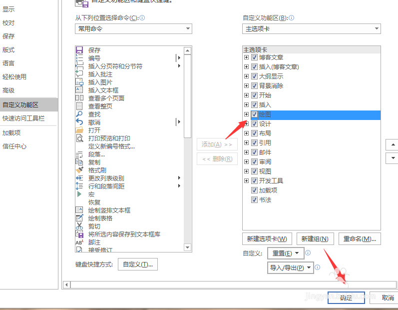 2、之后在右边可以依次的找到绘图,这里默认是没有被勾选上的,我们把绘图勾选上。点击下方的确定保存。