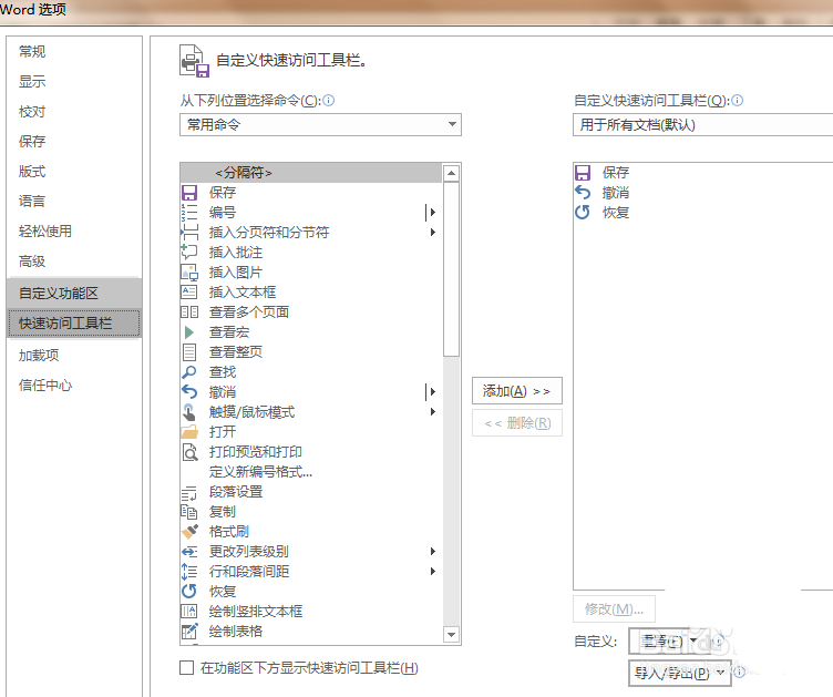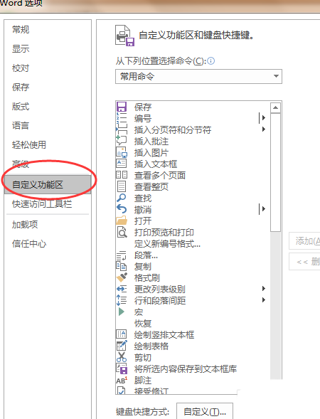 1、在word详细的参数设置里,我们先找到自定义功能区并点击它。
