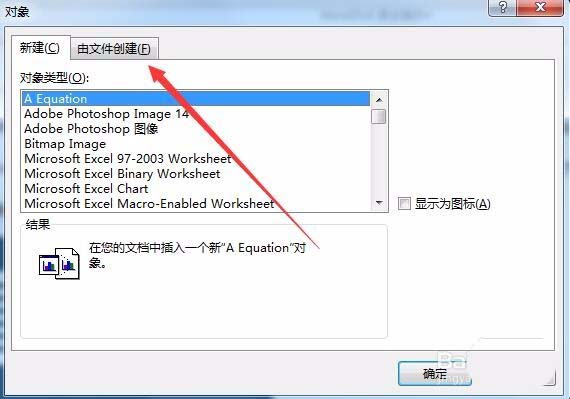 3、这时就会插入对象窗口,点击窗口上面的"由文件创建"标签