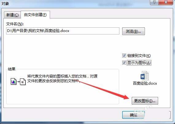 6、如果想更改在插入文档中附件的图标,可以点击下面的"更改图标"按钮。