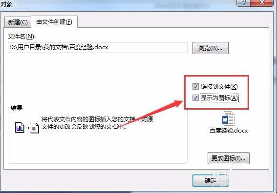 5、接下来可以选中"链接到文件"与"显示为图标"两个复选框,这样附件就会以图标的显示在Word文档中显示了,同时点击后会快速打开附件的文档。