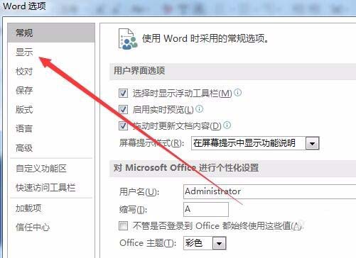 5、这时会打开word2016的选项窗口,点击窗口中的"显示"菜单项