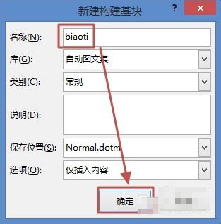 3、打开"新建构建基块"对话框,输入要保存的名称,如"biaoti",然后单击"确定"。