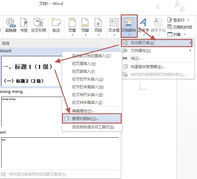6、删除自动图文集的内容:在"插入"选项卡,单击"文档布局",选择"自动图文集",然后选择需要删除的自动图文集,然后右击选择"整理和删除"。