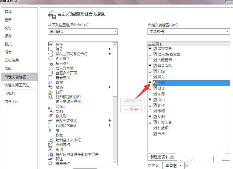 3、在设置里我们找到自定义功能区。然后把绘图勾选上,这样我们就可以在word里使用它了。
