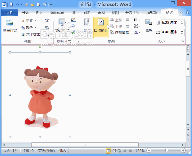 3、选择调节好的图片找到自动换行选项,点击该选项在其下拉菜单里找到浮于文字上方选项,点击该选项可以看到其效果如图所示: