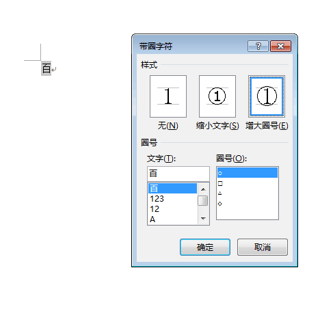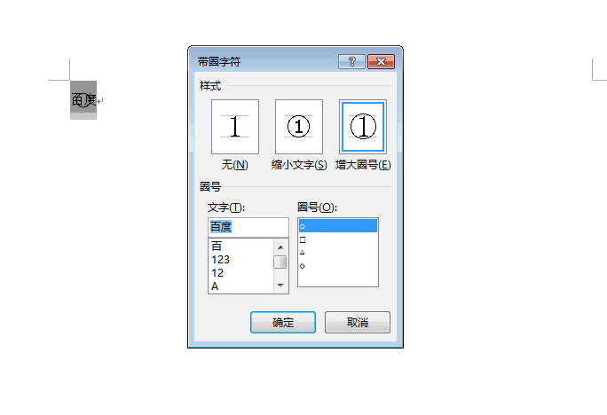 2、选择增大圈号然后点确定,到此字体外围就加了个圆圈