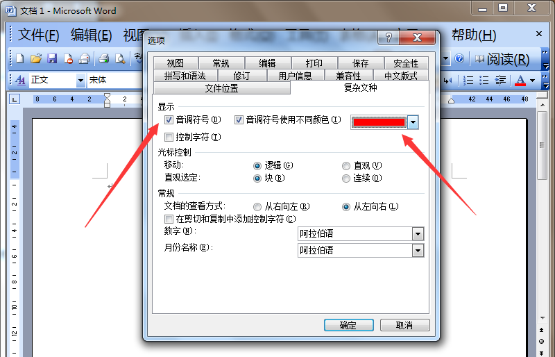 6、我们点击打开后,将"音调符号"复选框勾选上,再将后面的"音调符号使用不同颜色"也勾选上,这时我们就可以设置颜色啦!