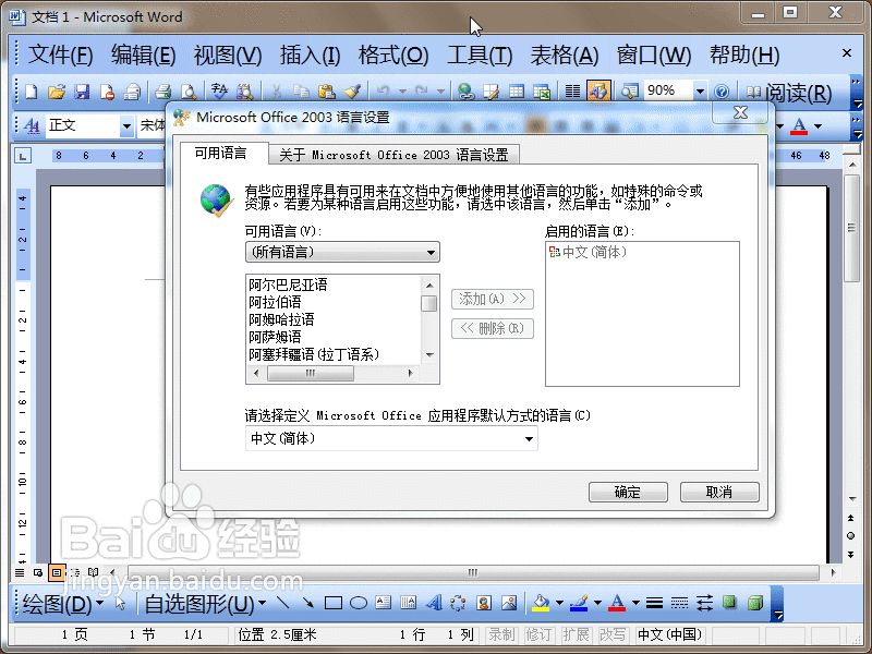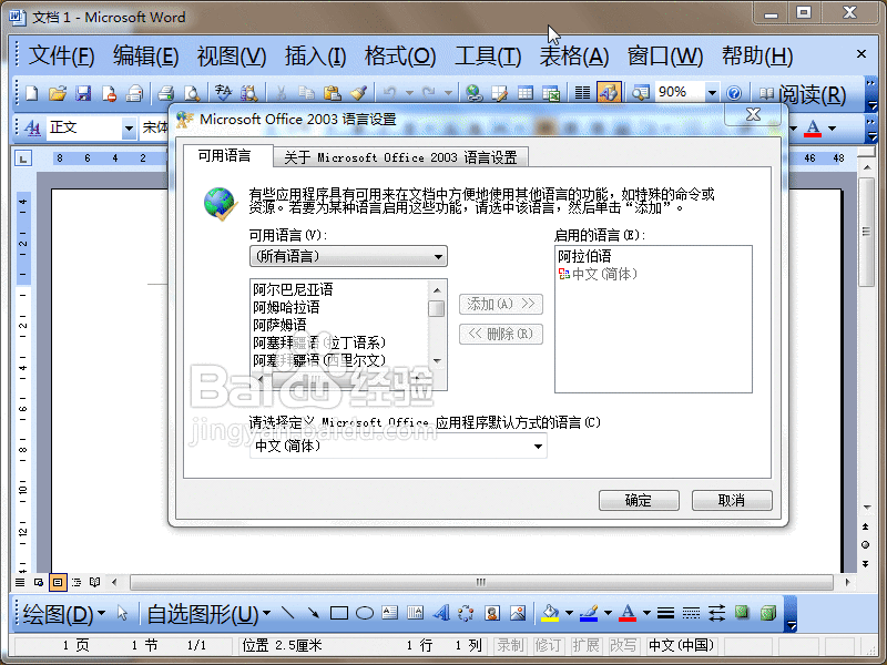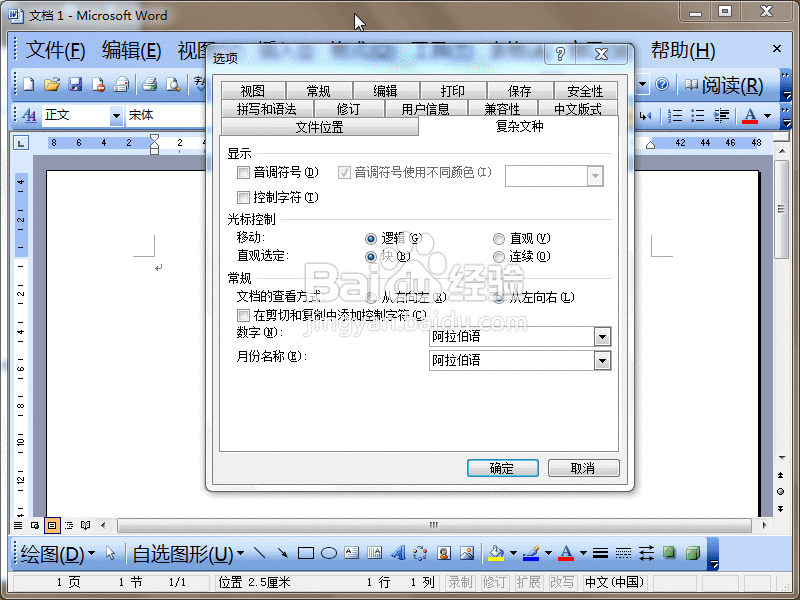 1、首先,我们要调出"复杂文种"选项,如果没有我们就需要先去设置一下office语言。(小编这里调出来了)