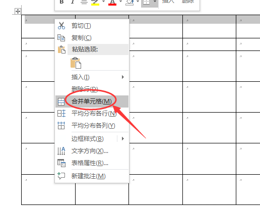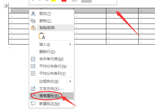 2、鼠标选中表格第一行,右击后选择【表格属性】