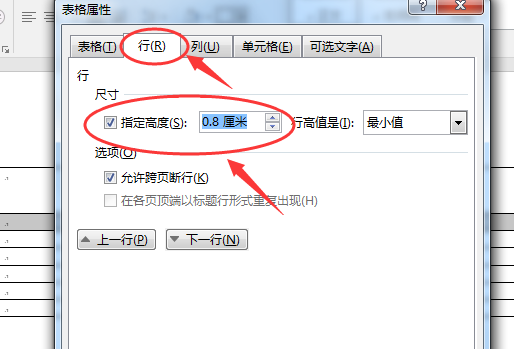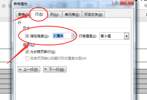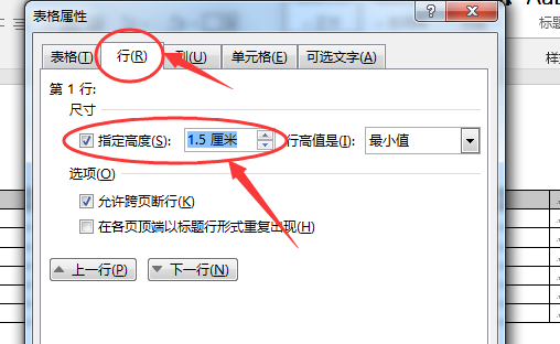 3、在【表格属性】中切换到【行】【尺寸】,勾选【指定高度】设置,并且合并第一行的单元格