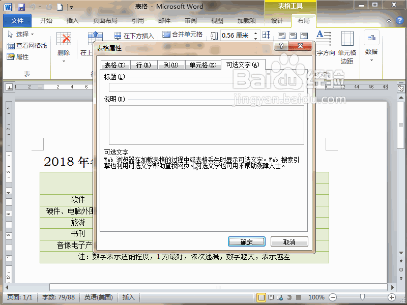 3、弹出表格属性对话框,点击可选文字选项卡,把光标定位在标题下方的文本框里。