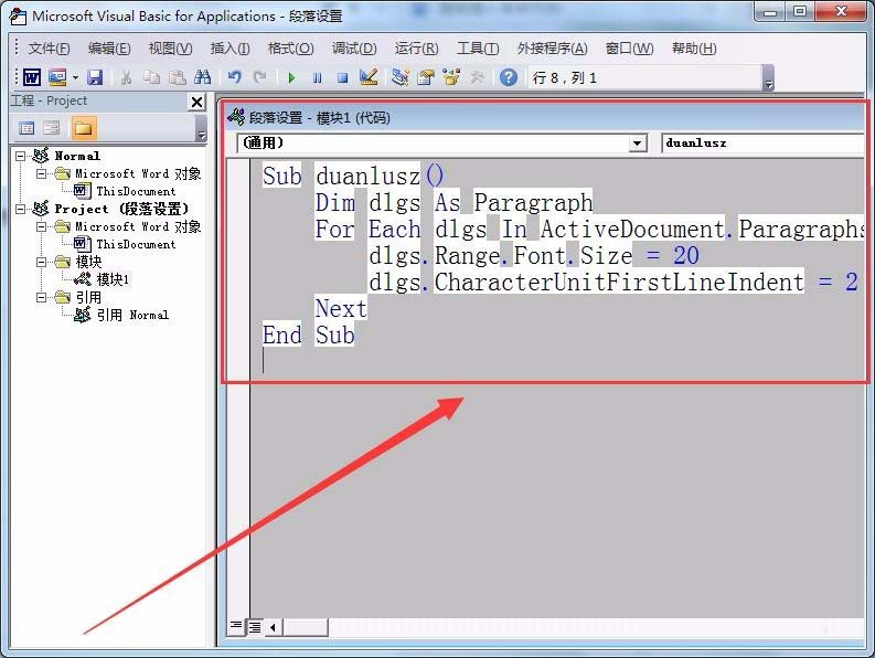 1、首先,打开Word2010的VBA编辑器,输入一段代码。