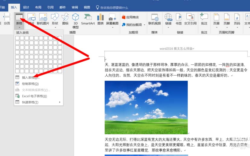 2、如何让文字与图片快速排版,变成我们常见的左边图,右边文字的排版呢。这时候就需要插入表格来完成。点击【插入】——选择【表格】——【插入表格】