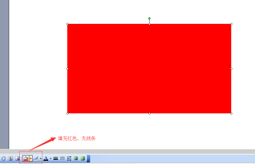4、选中我们绘制的矩形,在绘图工具栏中找到填充颜色命令,将我们矩形的跳虫颜色改为红色;在找到线条颜色命令,将我们的线条颜色改为无线条颜色。使矩形呈现如下的效果。