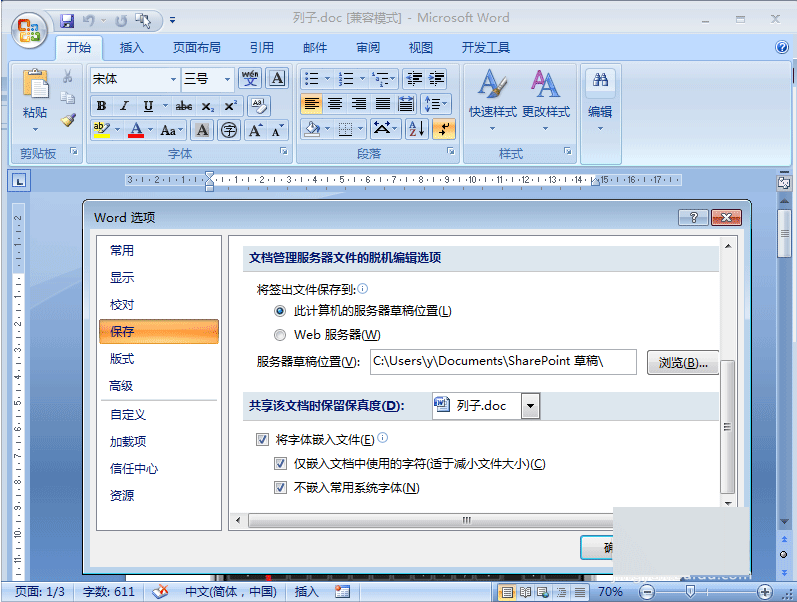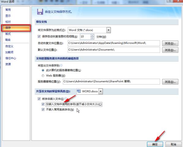 点击"将文字嵌入文件"前打√,并勾选下方的两个选项