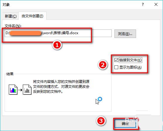 2、可以按照需要点击"链接到文件"。选择"显示为图标"效果就会与步骤2一样。选择了"链接到文件",当源文件有变化时,会同步更新到文档中。