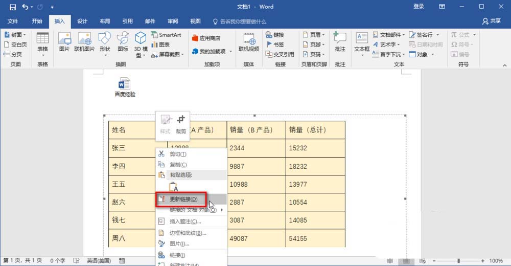 6、接着在表格中右键,点击"更新链接"。